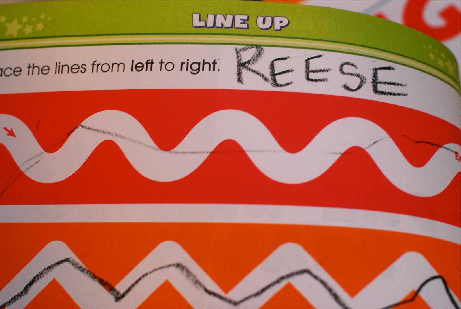 At the top of each page she spelled out her name so I could write it. When I forgot, you better believe she was sure to remind me. Below is her very first work book attempt. The goal was to draw a line from one side to the next while staying in the white.